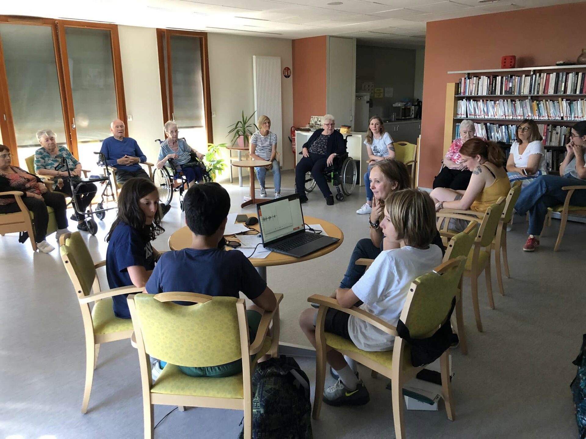 Accompagné de leur animateur, un groupe de jeunes est intervenu au sein de l’EHPAD pour y créer une radio éphémère, en reproduisant les conditions d’un direct. Les jeunes ont préparé et mené des entrevues avec les personnes âgées, puis diffusé leurs échanges en ligne afin de rendre ce contenu accessible au plus grand nombre. Les discussions ont porté sur des thèmes simples, mais profondément humains : « Comment était l’école à votre époque ? », « Comment vivait-on sa jeunesse autrefois ? ».