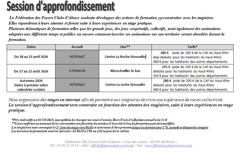 – Renvoyer le dossier d’inscription à : Fédération des Foyers Clubs d’Alsace – 4 rue des Castors 68200 MULHOUSE ou par mail : fdfc68@mouvement-rural.org